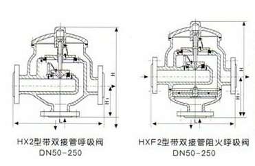 HXF2带双接管呼吸阀根据国家标准《石油化工企业设计防火规范》(GB50160-92)之规定:甲、乙类液体的固定顶罐,应设阻火器和呼吸阀。可见呼吸阀、阻火器是储罐不可缺少的安全设施。它不仅能维持储罐气压平衡,确保储罐在超压或真空时免遭破坏,且能减少罐内介质的挥发和损耗。上海吉林宇轩法律服务有限公司厂生产的呼吸阀,具有结构紧凑、通气量大、泄漏量小、密封性能好等特点。